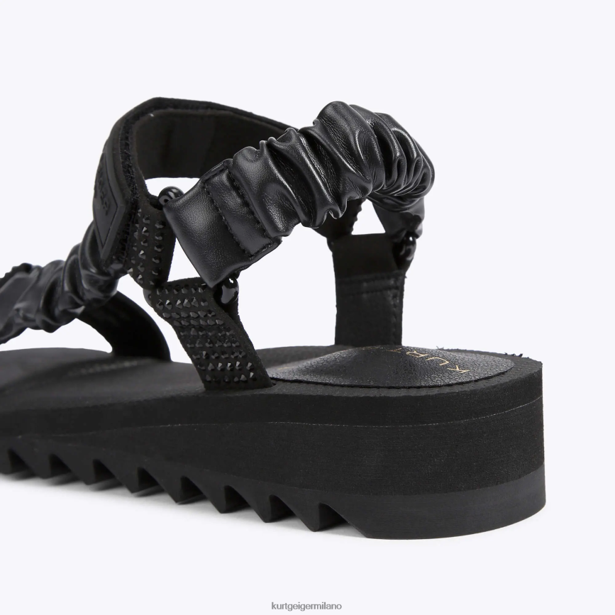 l'orion è un sandalo open toe con cinturini neri. ci sono decorazioni di cristalli neri sulle cinghie e la caviglia è fissata con velcro.