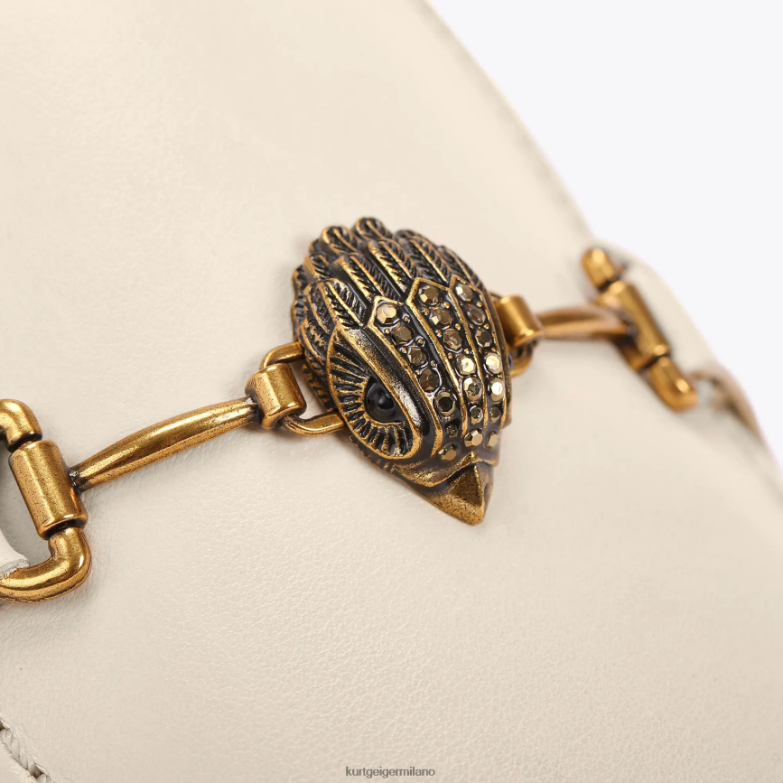 ali è un mocassino slip on realizzato in pelle color crema. la punta è sormontata da catena con morsetto in ottone anticato con testa d'aquila impreziosita da cristalli.