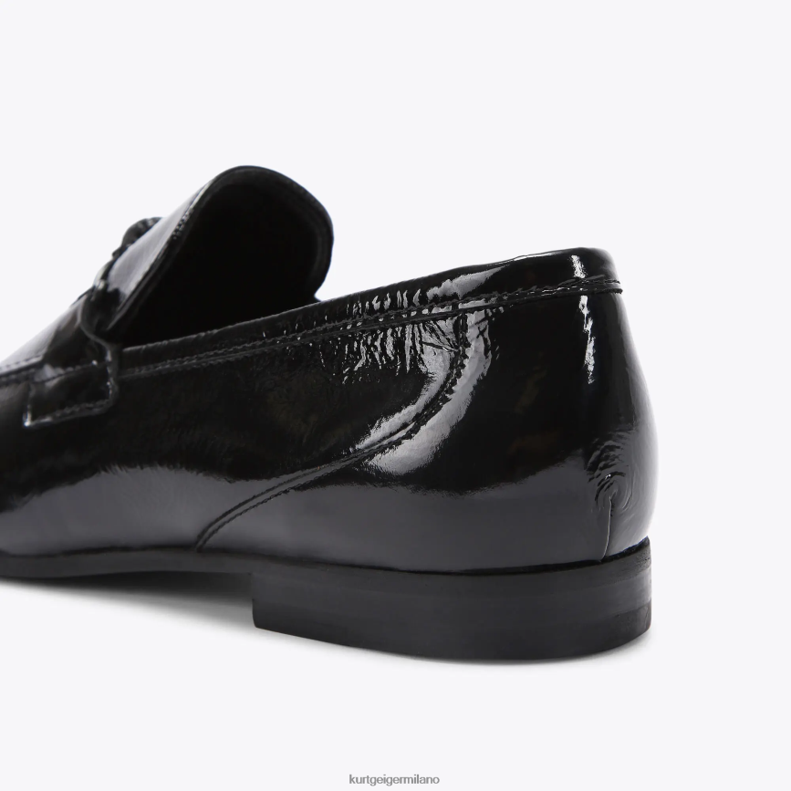 ali è un mocassino slip on realizzato in pelle verniciata nera. la punta è sormontata da catena con morsetto in metallo nero con testa d'aquila impreziosita da cristalli.