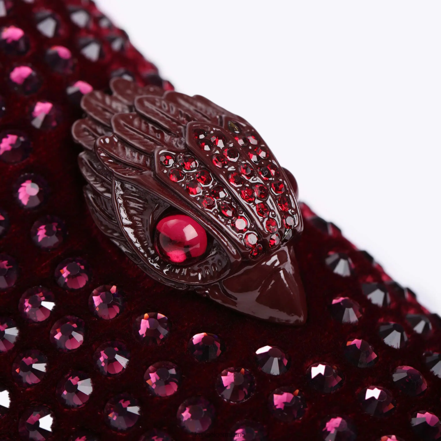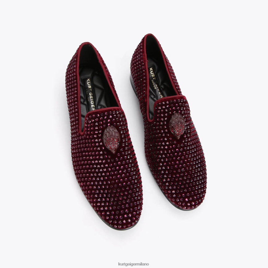 gli ace stud sono un mocassino slip-on in velluto con testa di aquila color vino con cristalli rossi e occhi di perline sulla tomaia anteriore. sono presenti anche decorazioni in cristalli di vino sulla tomaia.
